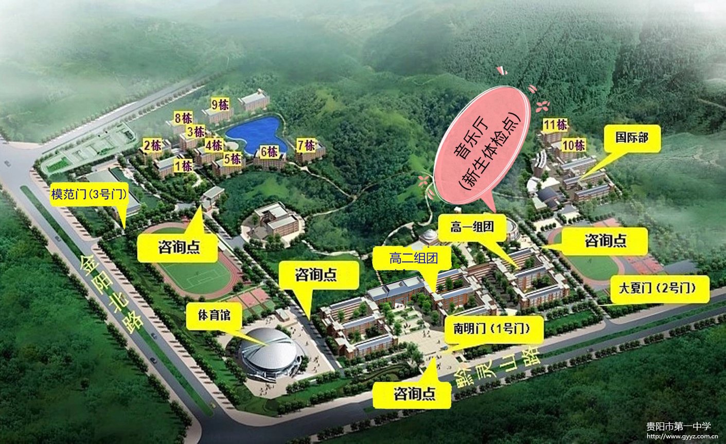9:00-13:00所有学生(包括地州和贵阳市学生)入住宿舍完毕(学校在校园内设有多个报到入住咨询点,可在“贵阳一中新生入学引导图”查看,如有不清楚之处可前往咨询)。家长及新生可从1号门、2号门及3号门通道进入校园。