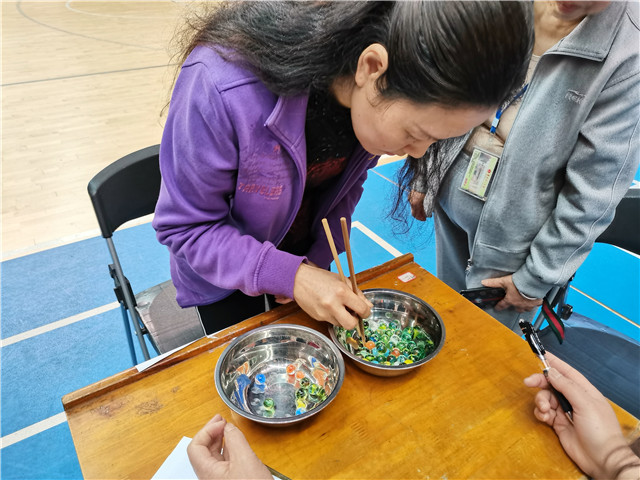 参赛选手正在参加“夹弹珠”项目比赛