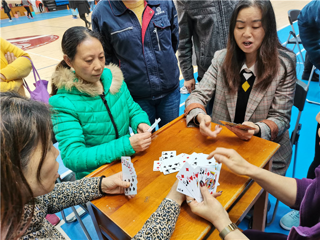 参赛选手正在参加“扑克牌接龙”项目比赛