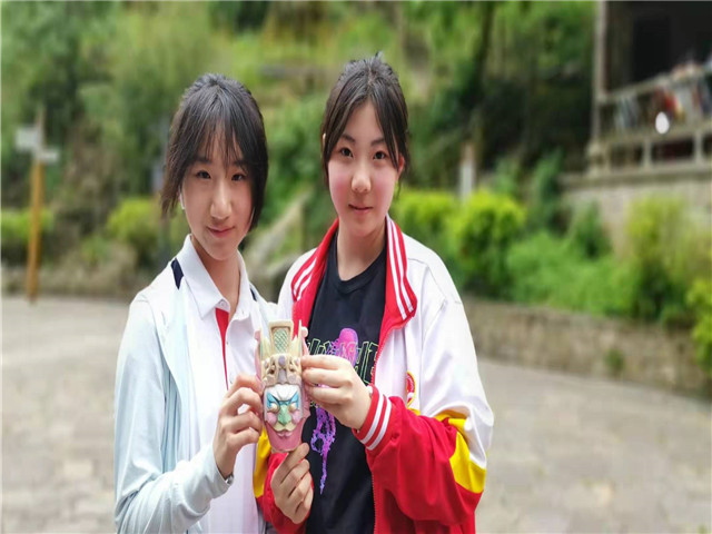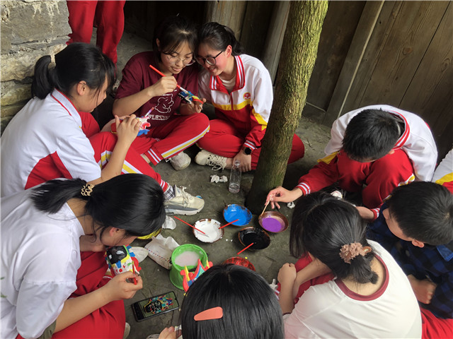 “地戏”,当地老百姓称为“跳神”,是江南水乡文化、军旅文化、当地本土文化在历史长河中逐渐交融发展而成的,是安顺屯堡文化中最具有人文精神的文化现象。鲍家屯地戏班子的表演,让大家对地戏的表演形式有了感性的认识。傩面是地戏的重要道具,同学们亲自动手,给傩面上色。按照人物不同的形象、立场划分,地戏面具大致分为“将帅面具”“道人面具”“丑角面具”和“动物面具”四大类,面具色系大致分为“红、粉、蓝、黄、青”五大色调。当自己亲手上色的面具完成之后,同学们对地戏文化有了更多的了解。
