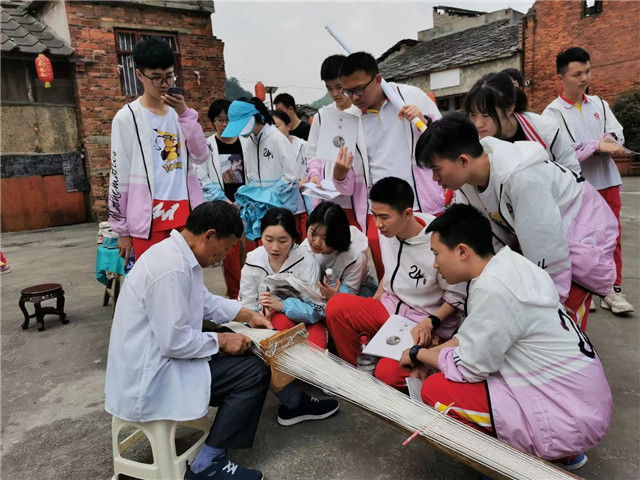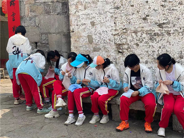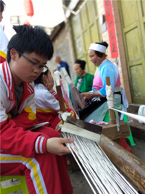 屯堡服饰是屯堡人的文化表征,在屯堡村寨,无论走进哪家哪户,最引人注目的首先是妇女的服饰。屯堡中流传着四句话,“头上一个罩罩,耳上两个吊吊,腰上两个扫扫,脚上两个翘翘”,其中“罩罩”指的是当地妇女“三络头”发型,“吊吊”指的是妇女们的银耳环,“扫扫”指的是丝头系腰,“翘翘”指的是凤头鞋,这四句话高度概括了当地妇女服饰的特点。屯堡妇女服饰文化展示着600年前明朝汉人的习俗,被称为明代服饰“活化石”,有着深厚的历史文化价值。同学们饶有兴趣地观摩老人们纺线、制作“丝头系腰”的过程,看着繁琐的工艺,精美的腰带和绣工讲究的凤头鞋,同学们连连咋舌,纷纷点赞,女同学们还拿起针线,有模有样的跟着绣起来。