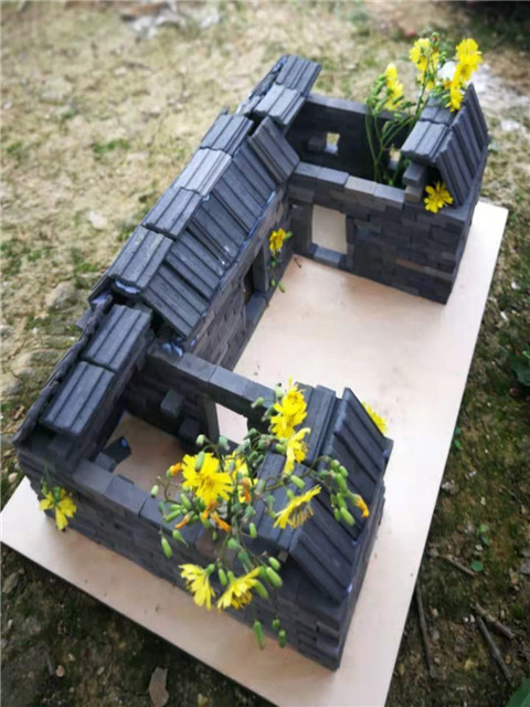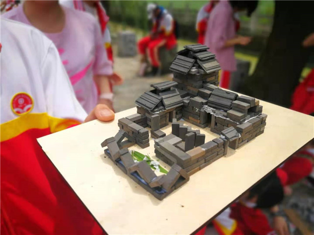 游览完毕,同学们意犹未尽,三个一群,五个一伙,在村前的广场上利用简单的工具和材料制作起建筑模型来。好像要与几百年前的建筑师们比比高低,他们精心设计,细心施工,头上渗出汗水也顾不得擦,小心翼翼地搭建着自己的房屋。一个小时过去了,同学们的建筑设计颇有成效,看,一座座青砖青瓦的“房子”还不错嘞!