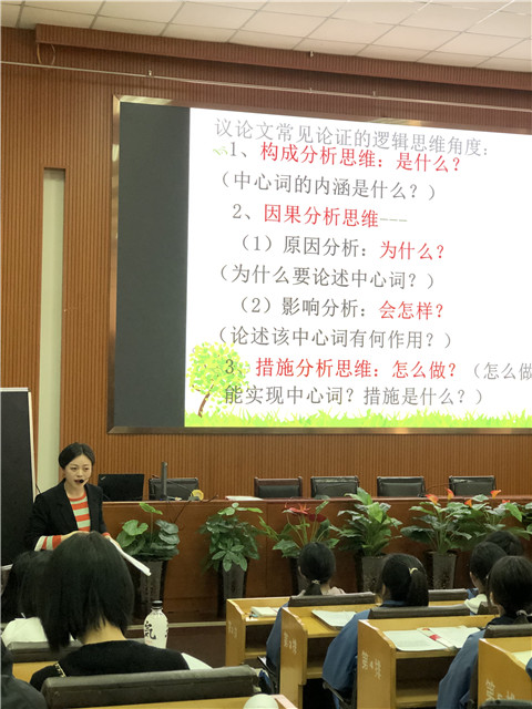 实验中学胡芹老师“诗歌鉴赏主观题答题升格方略”观摩课后,陈畅老师展示了“以逻辑思维建构作文框架之美——核心素养下高中议论文分论点建构升格训练”观摩课,陈老师从高考作文发展等级的“新颖”角度入手,引导学生借助逻辑思维,用“谐音”的艺术方法别出心裁地搭建作文主体结构框架。