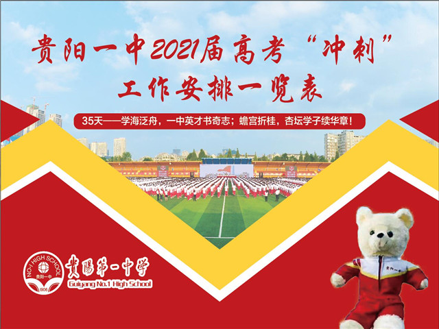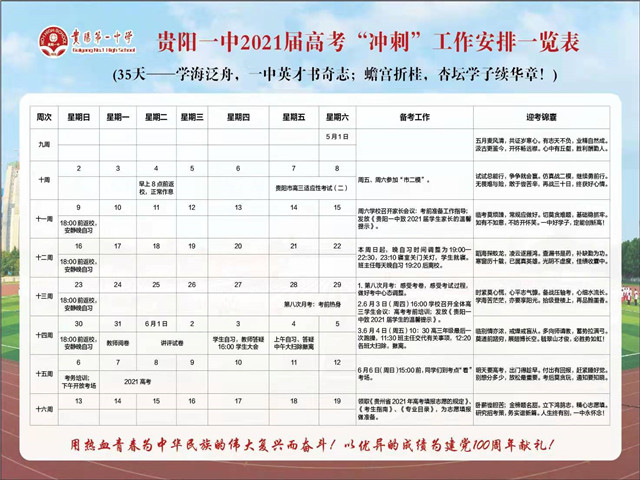 “十年铸剑只为炉火纯青,一朝出鞘定当倚天长鸣。”在距2021年高考还有30天之际,我校秉承传统,用精心制作的“2021届高考‘冲刺’工作安排一览表”为高三学子疏解情绪、出谋划策、加油打气。那日期下面的一行行小字,精准提醒着每位考生当日备考的重要事项;“备考工作”细致解读着每周的具体任务和安排;而“迎考锦囊”则以轻松幽默的打油诗为考生指明重要的备考事项,用诗情画意的方式让考生放松情绪、紧抓重点、轻松备考!小小的一张“安排表”凝聚着贵阳一中全体教师对2021届学子的殷殷嘱托,希望他们在心理调整、学习状态、作息安排、学习计划等方方面面都能渐入佳境,在今年高考中再续辉煌!