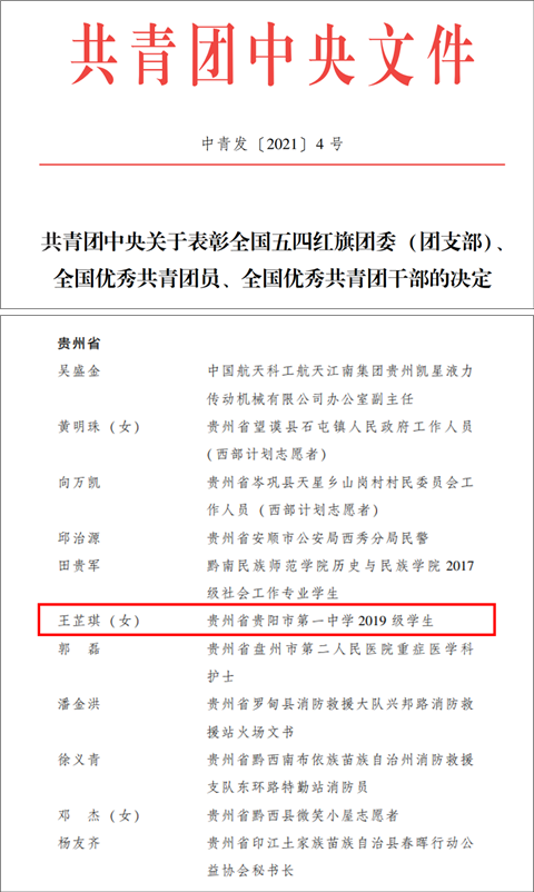 喜报|贵阳一中王芷琪同学荣获“全国优秀共青团员”称号