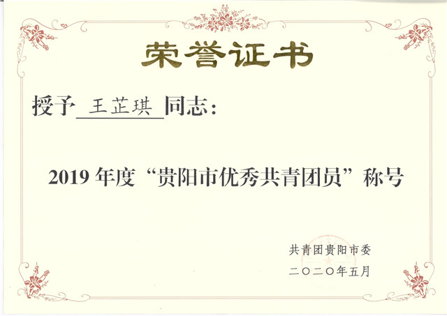 王芷琪荣获“贵阳市优秀共青团员”