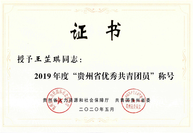 王芷琪荣获“贵州省优秀共青团员”
