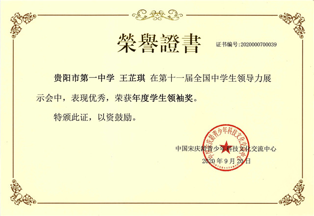 王芷琪在第十一届全国中学生领导力展示会中获“学生领袖奖”