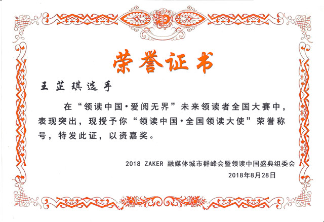 王芷琪荣获“领读中国 全国领读大使”荣誉