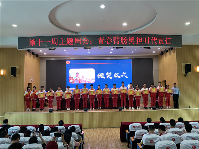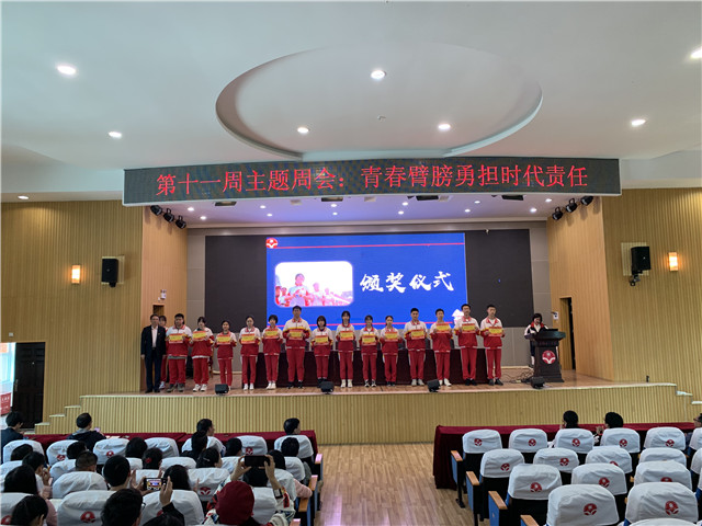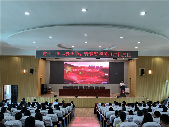 2021年5月10日上午,我校于行政楼四楼报告厅举行了第十一周主题周会活动,本次周会的主题为“青春臂膀,勇担时代重任”。今年是五四运动102周年,也是中国共产党建党100周年,世纪理想跨越百年,回首不忘奋斗初心。