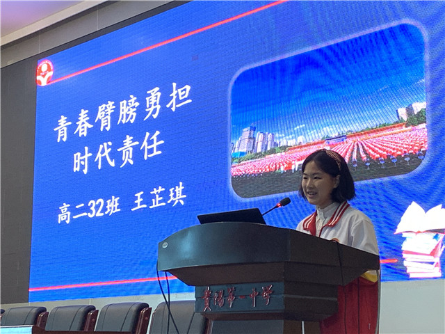 随后,由全国优秀共青团员高二(32)班王芷琪同学进行本周国旗下发言。从王芷琪同学的发言中,我们看到了一中学子的家国情怀,看到了一中学子的使命感与责任感,也听到了一中学子对实现自身青年价值的回答:奋斗报国、勇担重任与服务社会。