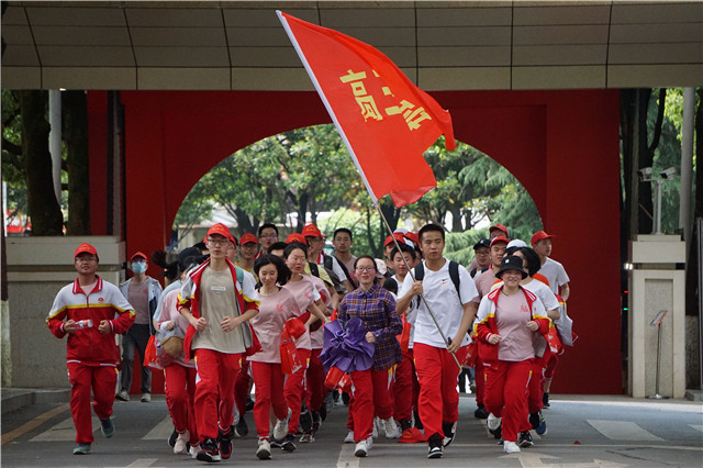 最后,本届高三学生代表分别从李校长手中接过“贵阳一中校旗”、“贵阳一中2021届毅行励志之旅活动旗”,在高三年级组长吴斌老师发令下“毅行励志之旅”出发!全体高三学子从一号门向观山湖公园进发,开启励志之旅。