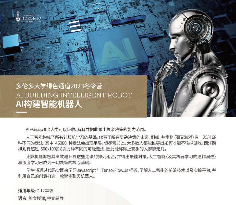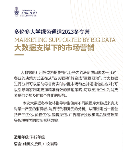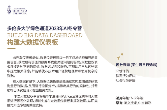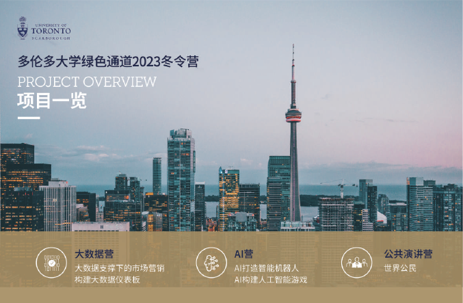 2023年多伦多大学冬令营项目共有三大板块:大数据营、 AI 营、公共演讲营。在三大类别中细分为五项课程:《大数据支持下的市场营销》《构建大数据仪表板》《AI构建智能机器人》《构建AI游戏》和《公共演讲 》。