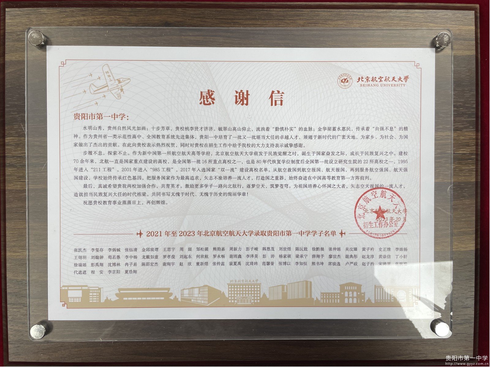 这几所高校赠予贵阳一中感谢信和“优秀生源基地”牌匾