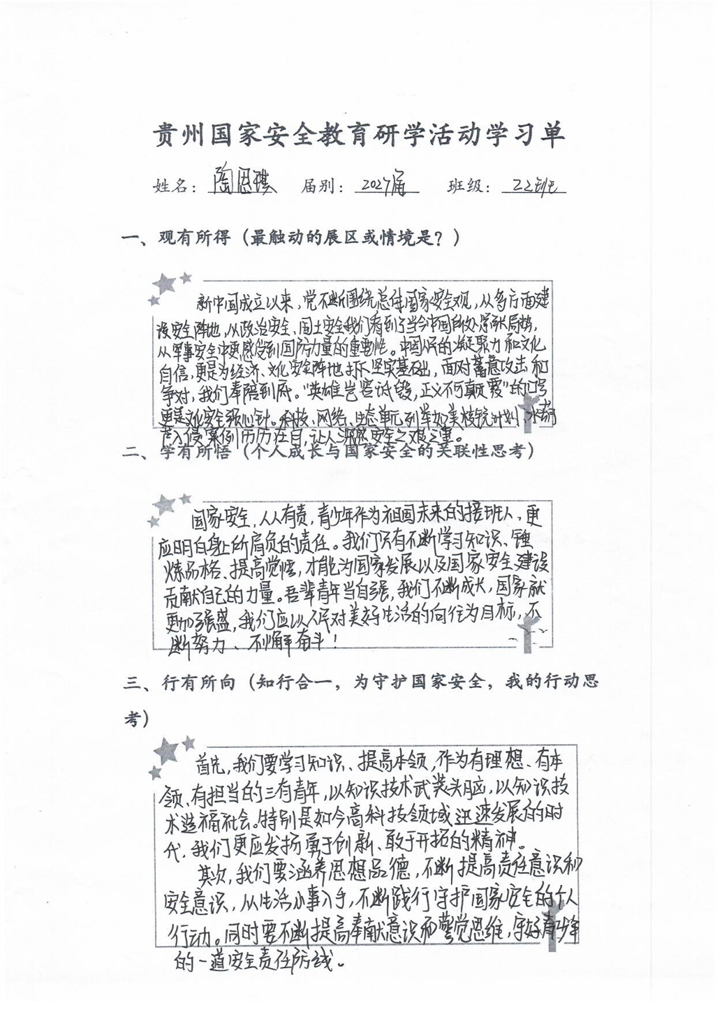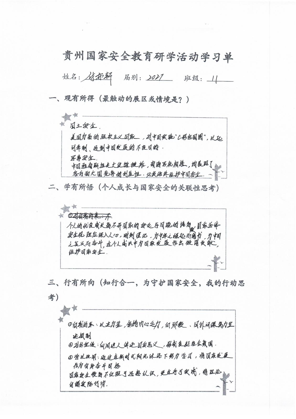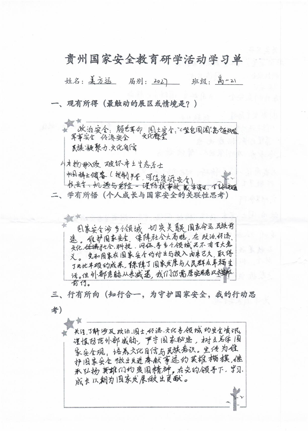 这堂国家安全教育课干货满满,活动接近尾声学生们仍意犹未尽,在会议室认真整理学习单,记录下所见所感。一张张工整的笔记中,“责任”“使命”“行动”成为高频词。高一(22)班陶同学写道:“吾辈青年当自强,我们不断成长,国家就更加强盛。”