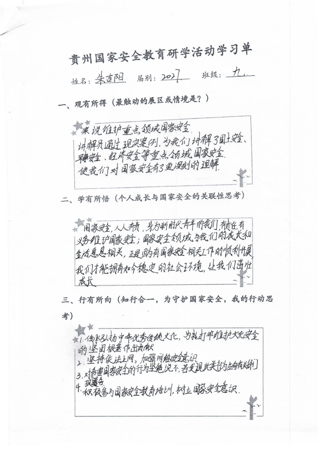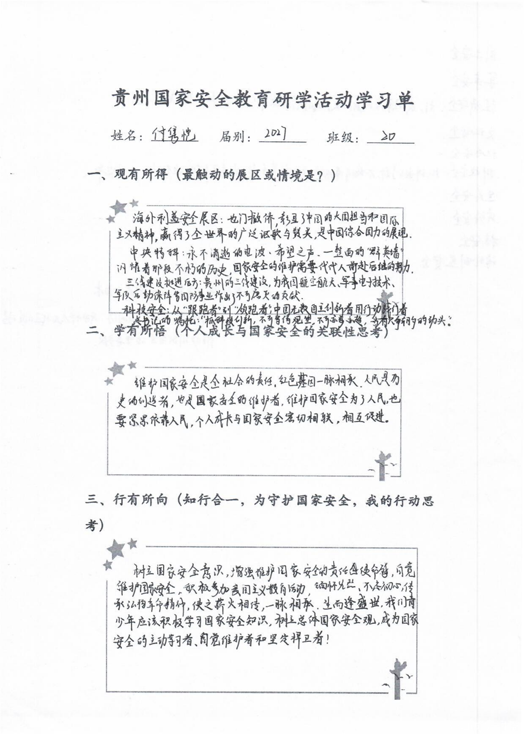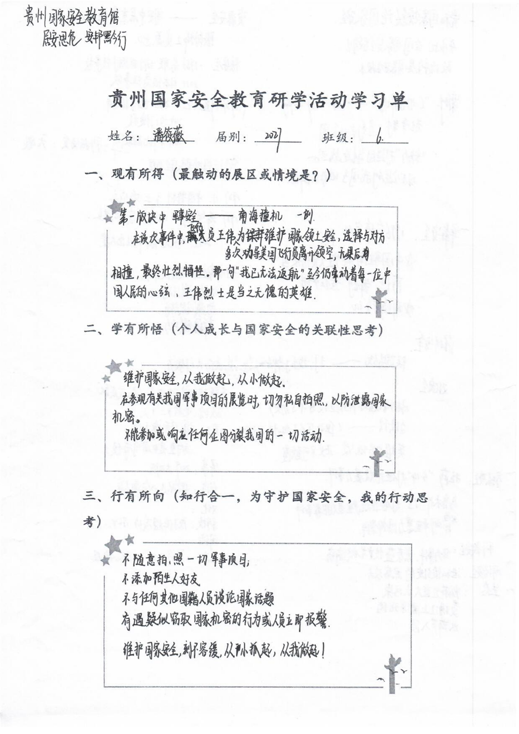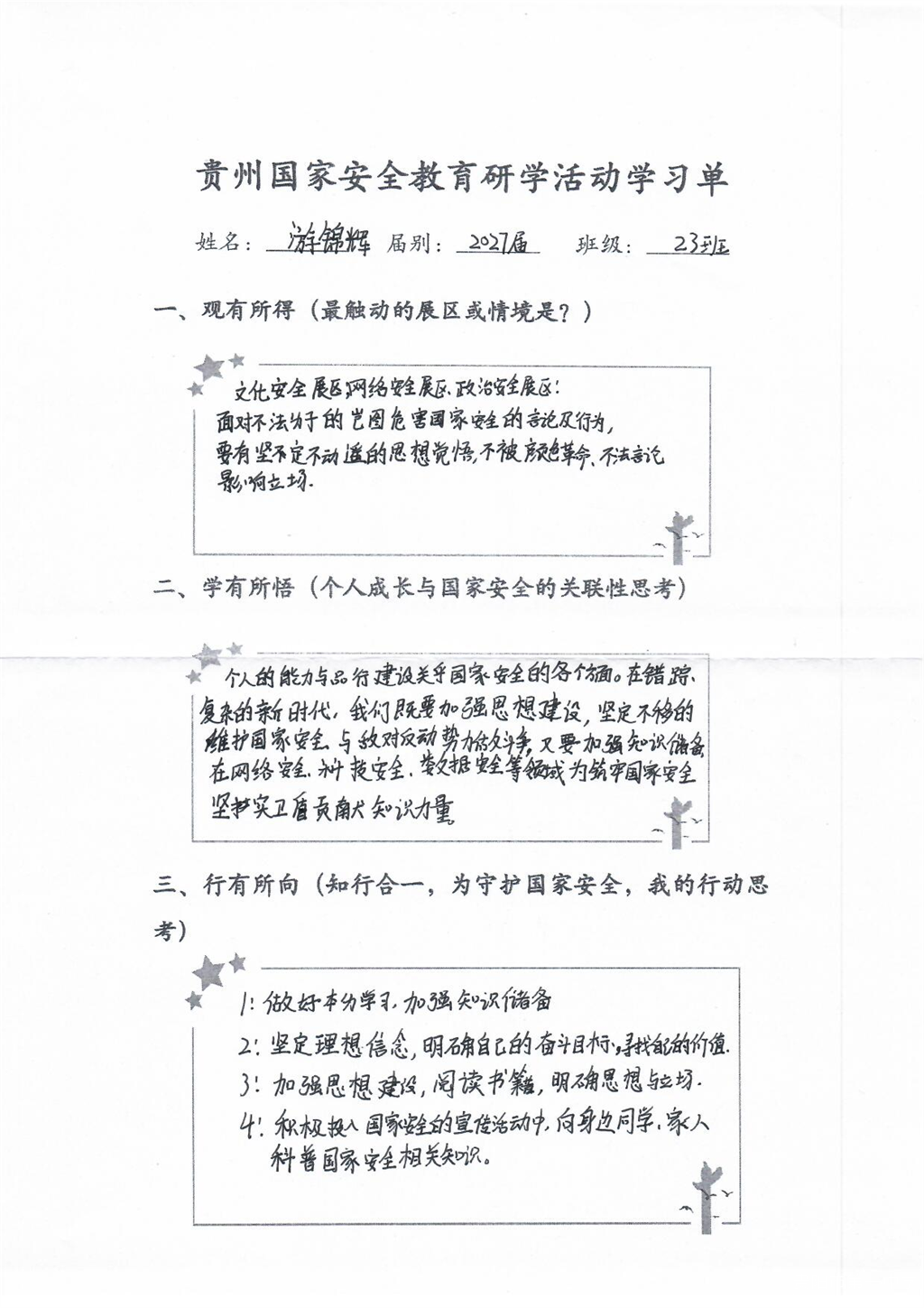 这堂国家安全教育课干货满满,活动接近尾声学生们仍意犹未尽,在会议室认真整理学习单,记录下所见所感。一张张工整的笔记中,“责任”“使命”“行动”成为高频词。高一(22)班陶同学写道:“吾辈青年当自强,我们不断成长,国家就更加强盛。”
