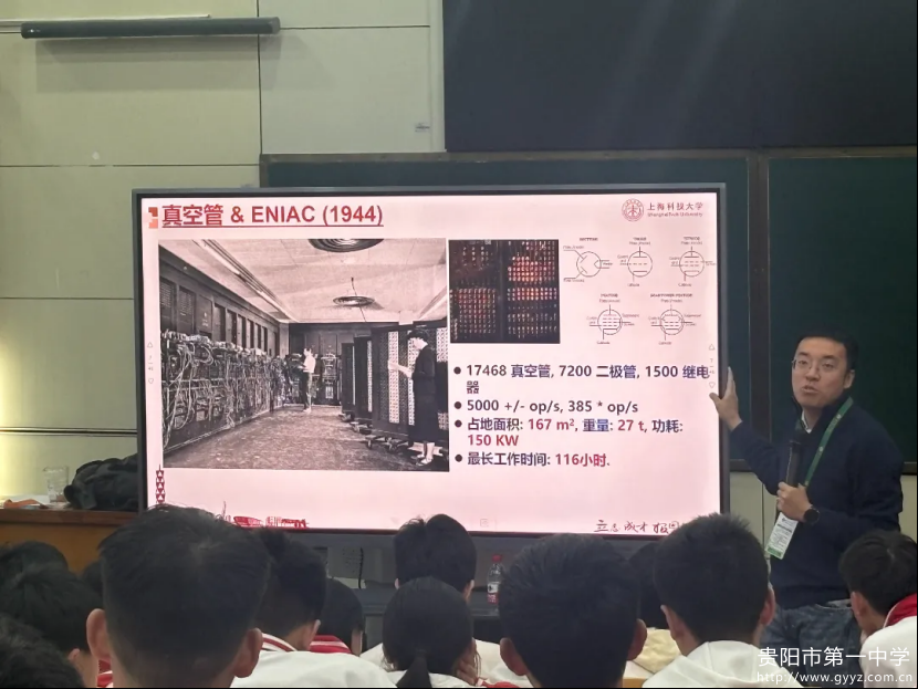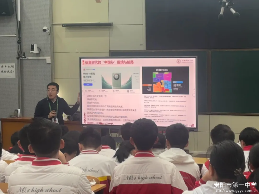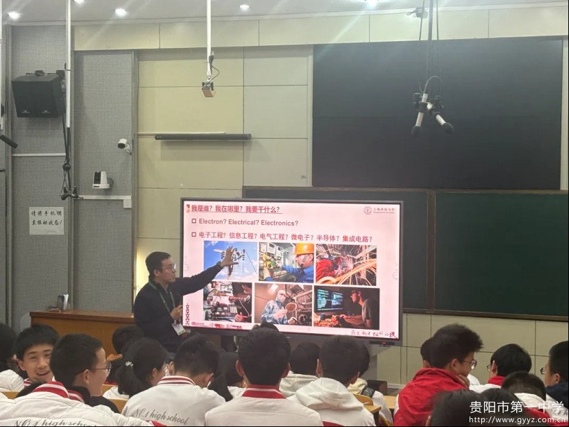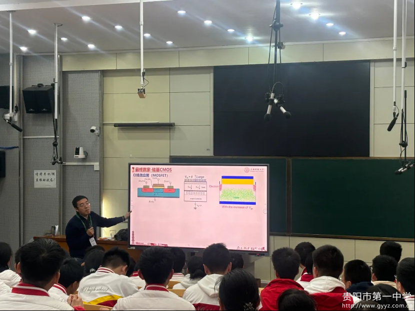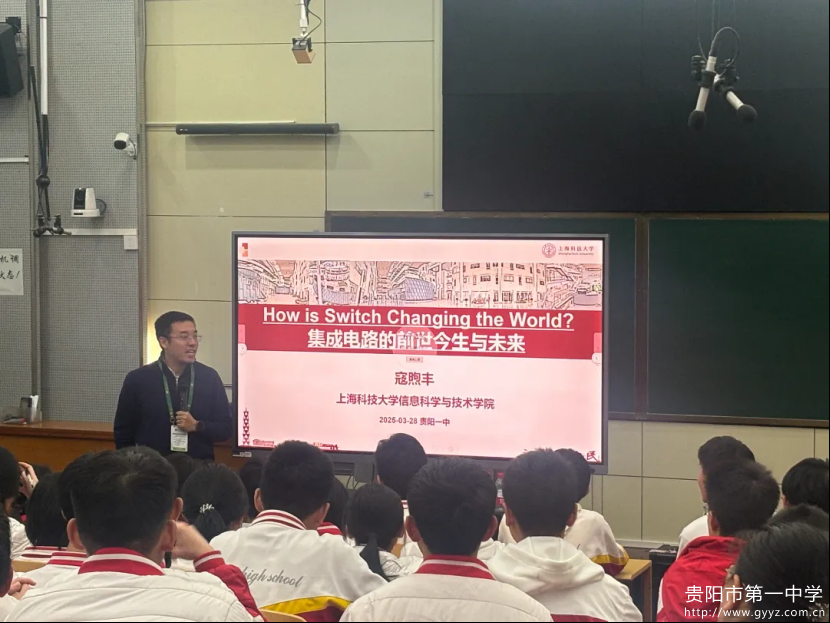 3月28日,我校有幸邀请到了上海科技大学信息学院长聘正教授——寇煦丰教授,为2027届学生带来了一场关于集成电路的前世今生与未来的学术讲座。本次活动为贵阳一中美好教育大讲堂之名师进名校系列活动之一,活动由高一年级甘玲子老师主持。