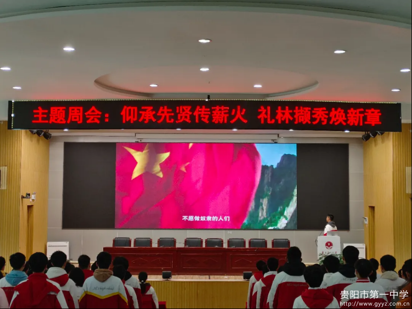 青山埋忠骨,翠柏勉英魂。清明时节将至,它不仅是祭奠祖先、缅怀英烈的日子,更是我们铭记历史、展望未来的时刻。3月31日上午,贵阳一中举行了“仰承先贤传薪火,礼林撷秀焕新章”2025春季学期第六周主题周会。贵阳一中全体教职工、部分学生代表到场参会,各班级学生在教室观看直播,高一(23)班付三农主持周会。