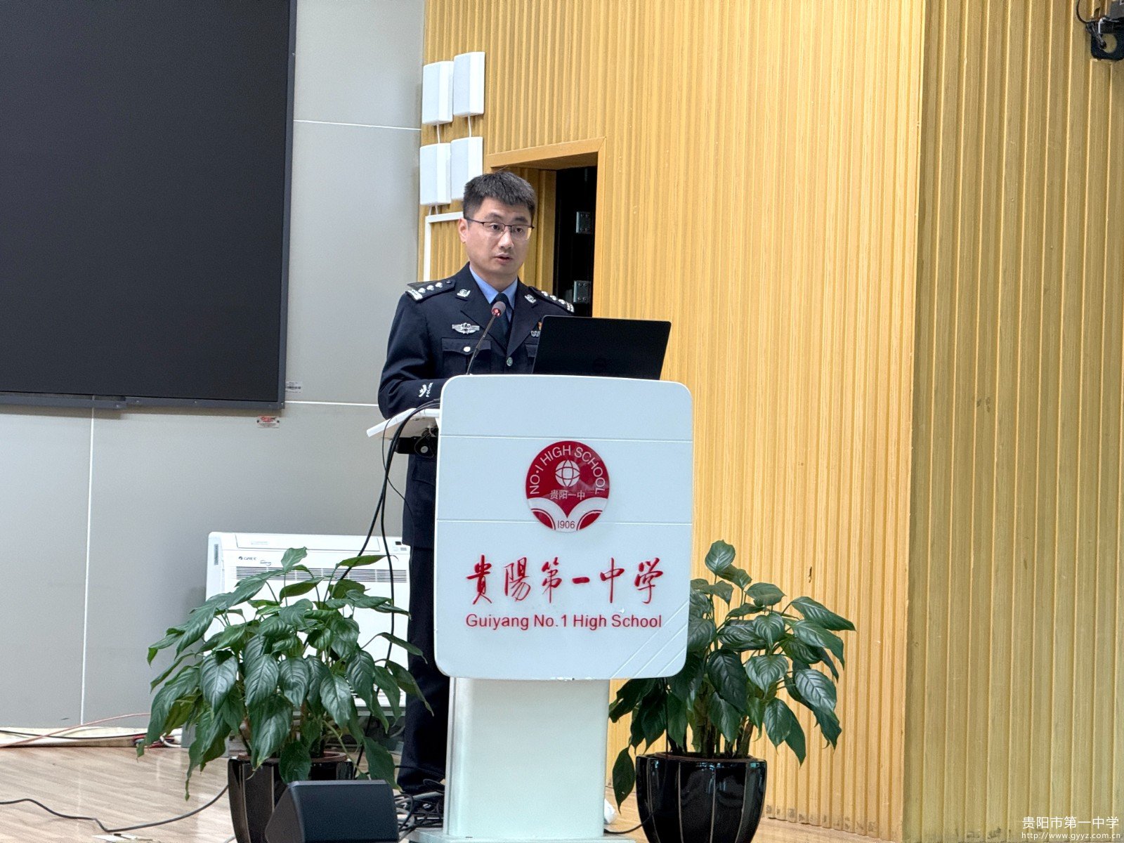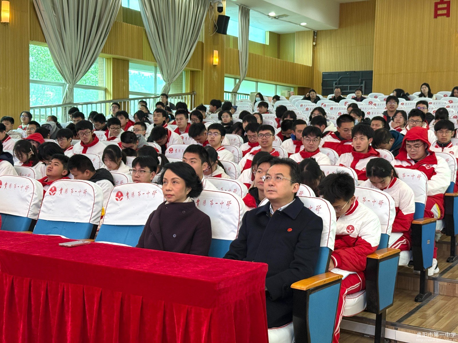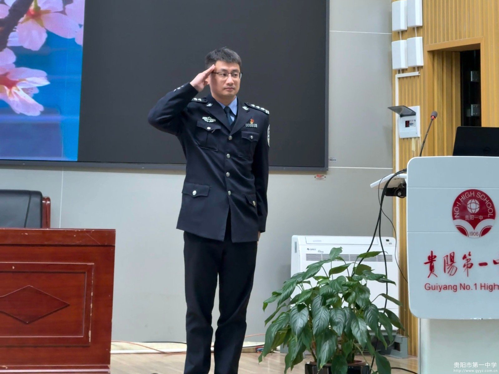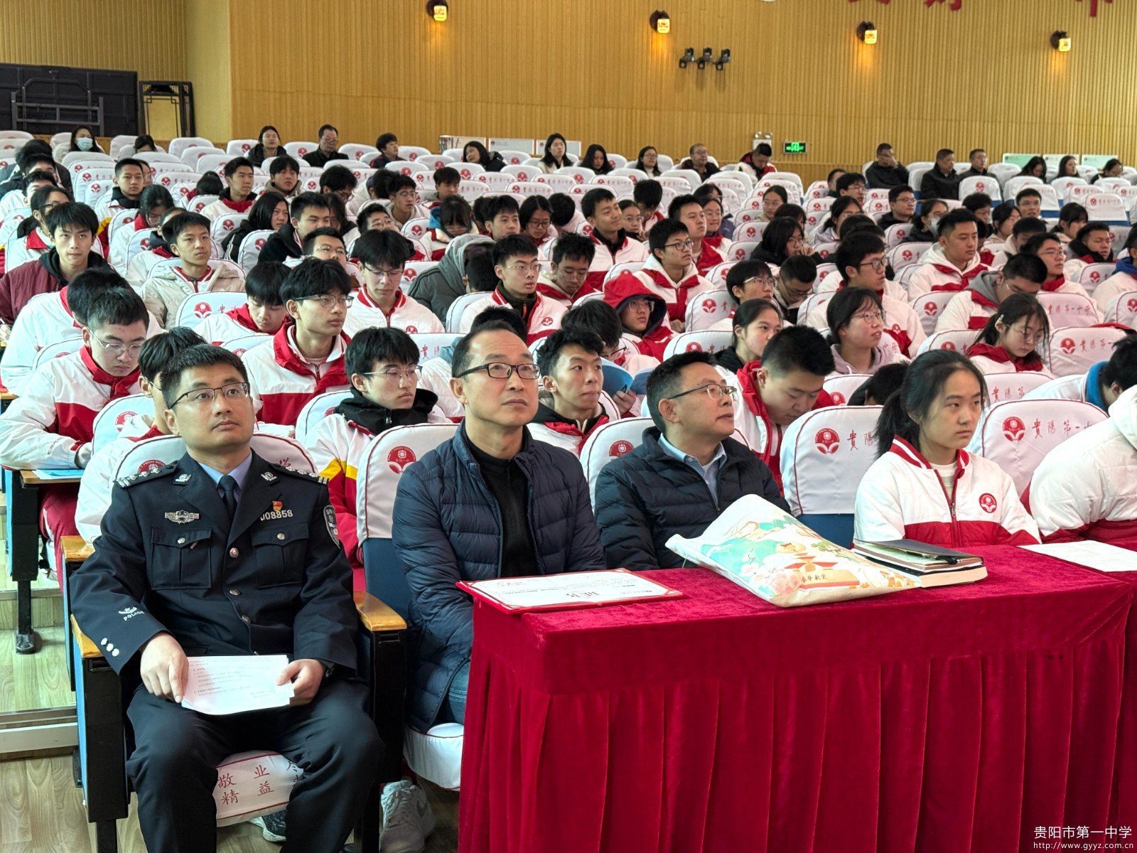受贵阳一中法治副校长杨波委托,观山湖公安分局党委委员、副局长郭明高作为特邀嘉宾为师生带来了一场深刻的法治宣讲。他结合自身工作实践,生动阐释了宪法在捍卫国家制度、保障社会公平、守护公民权利中的根本作用,鼓励全体师生共同学习宪法、遵守宪法、维护宪法。郭明高副局长还带领全体师生诵读宪法中的部分条文,共同感受宪法的庄严与神圣,增强了师生对宪法的敬畏之心,提高了宪法意识。
