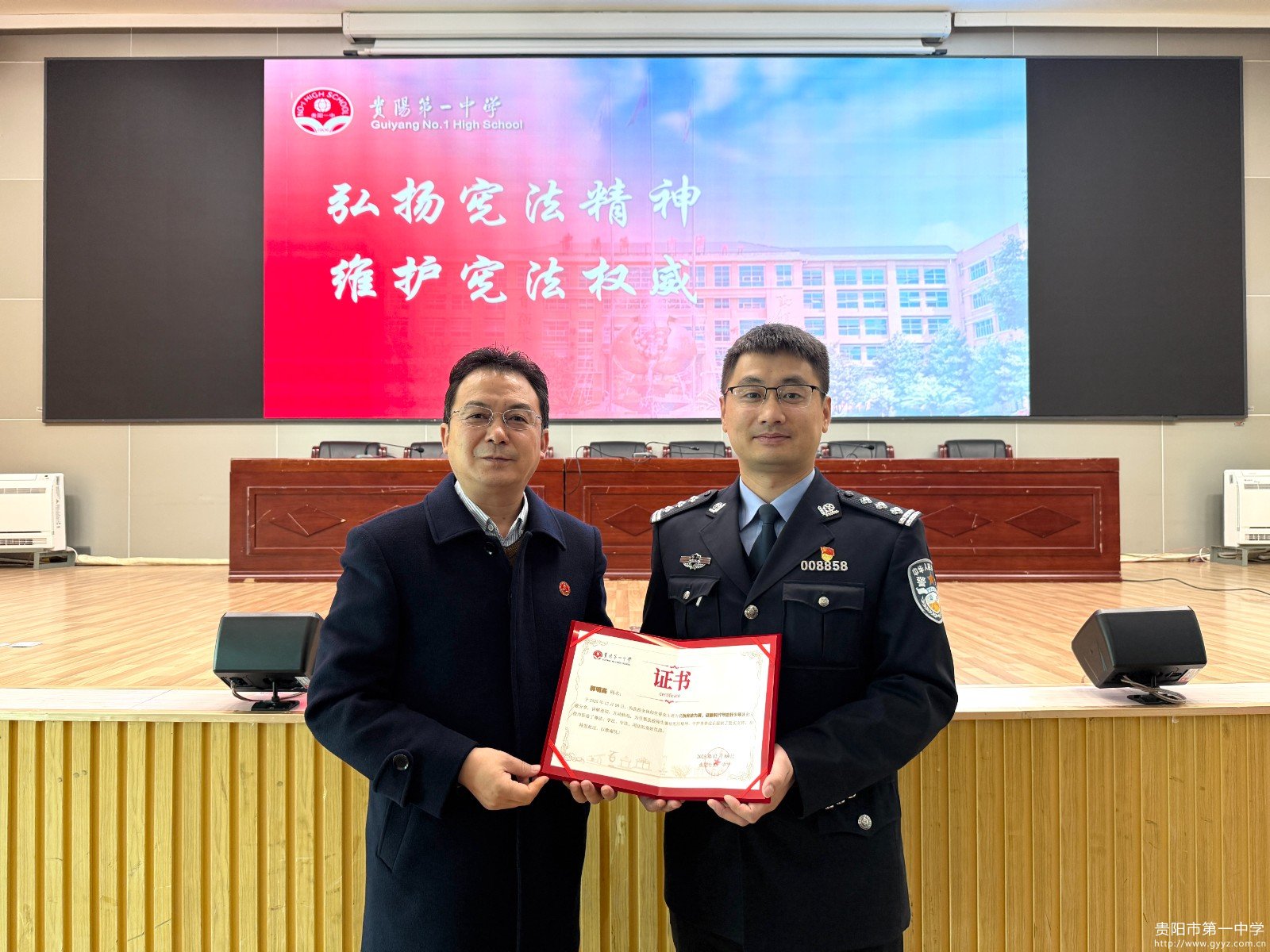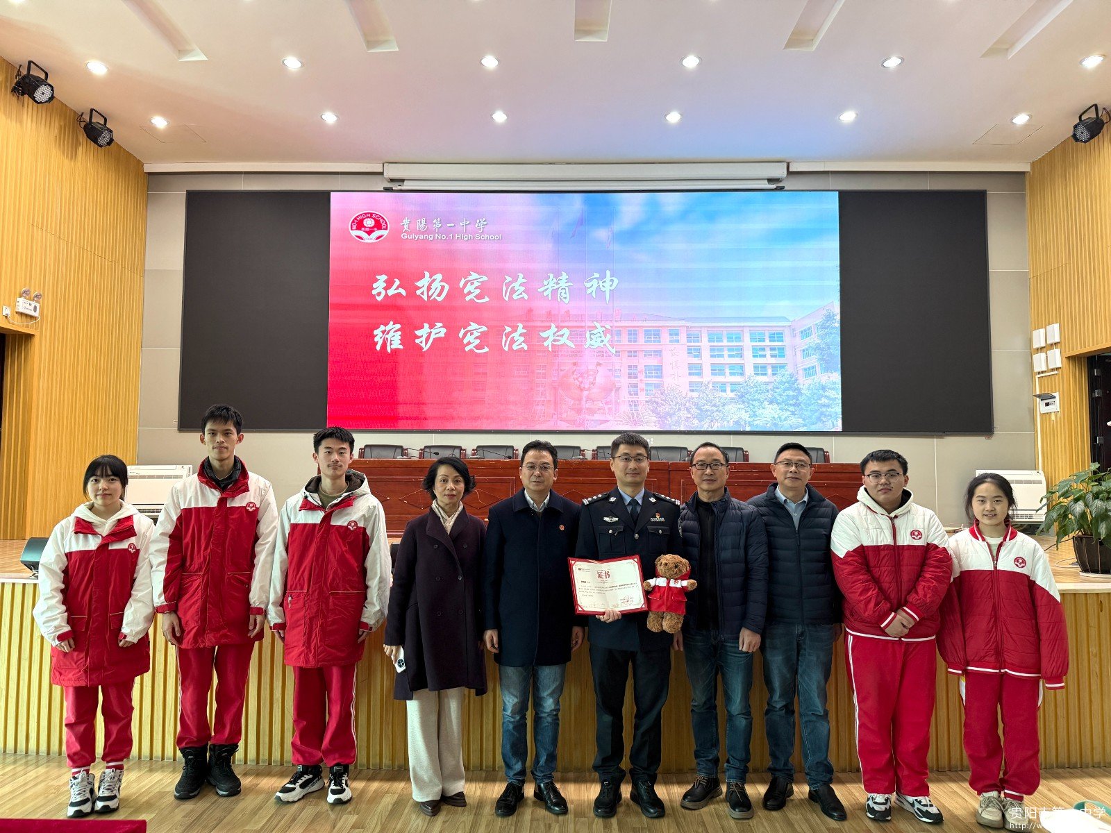 活动最后,曾强校长向郭明高副局长颁发了证书并合影留念。本次周会不仅是一场教育仪式,更是一堂生动的法治实践课。它激励全体一中师生将宪法精神内化于心、外化于行,自觉成为社会主义法治的忠实崇尚者、自觉遵守者和坚定捍卫者。一中学子定将把宪法精神熔铸为生活信念,以法治精神塑骨,以宪法权威立心,将宪法精神化为日常准则,书写无愧于时代的青春篇章。