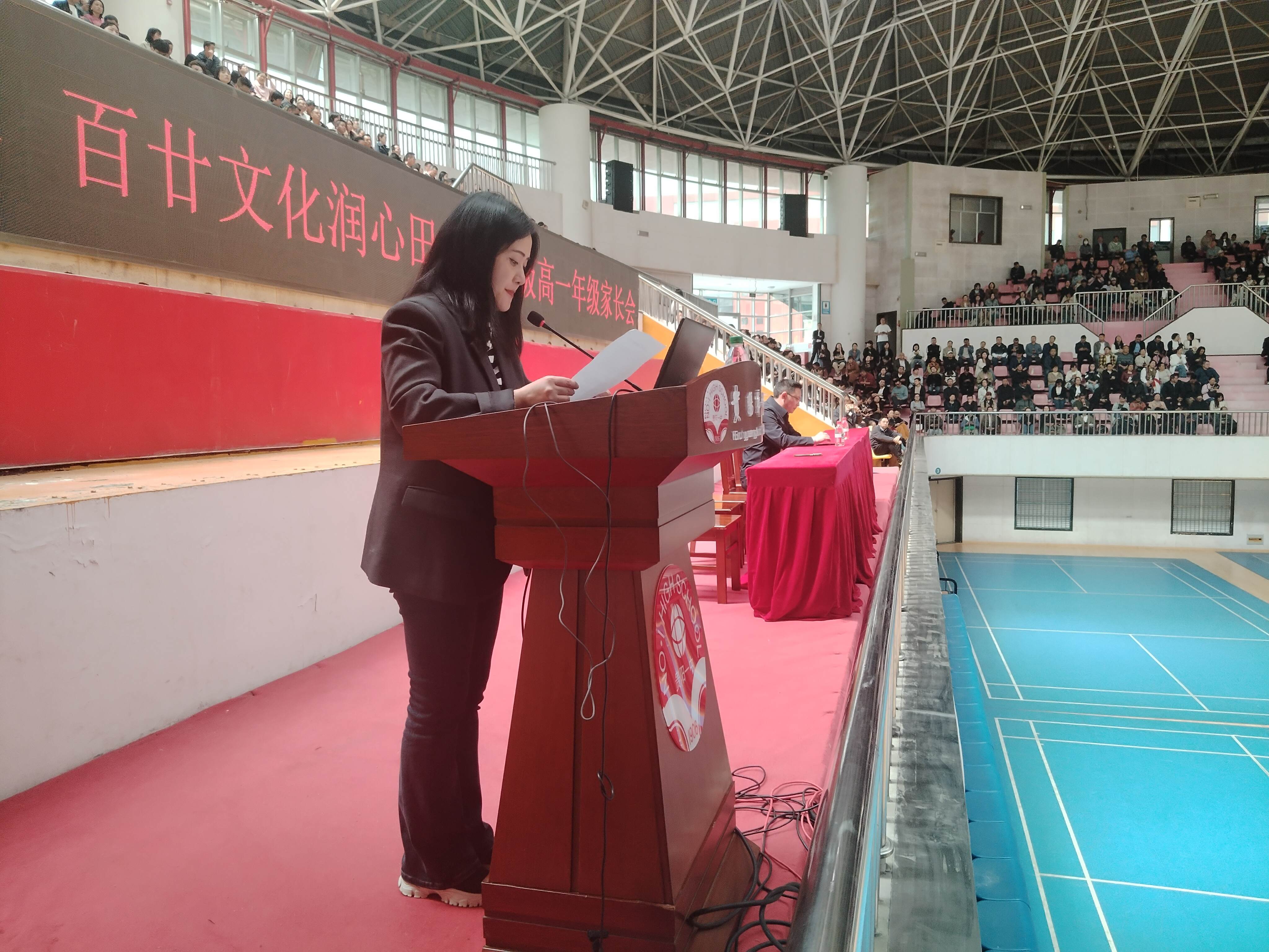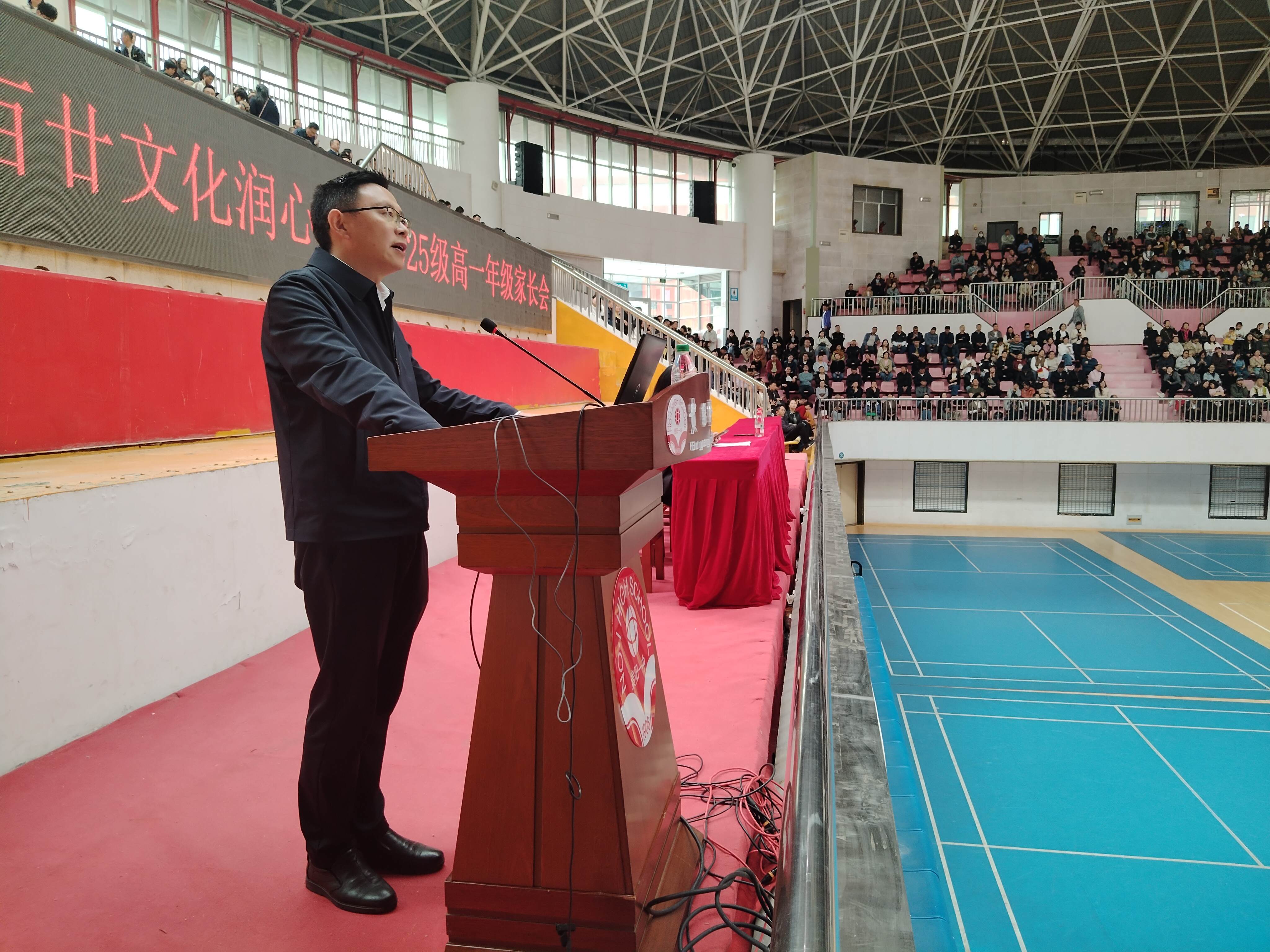 会议分为两个议程有序推进。第一部分主会场在贵阳一中体育馆举行,由教育处吴敏讷副主任主持。巩国忠副校长向全体家长全面介绍高一年级工作,让家长了解学校正带领高一年级全体师生,在“健康第一”的理念指引下稳步实现“五育并举”的实践;第二部分分会场则是基于学生学业与家校发展个性化需求,由各班班主任与科任教师在各班教室与家长展开面对面深入交流。